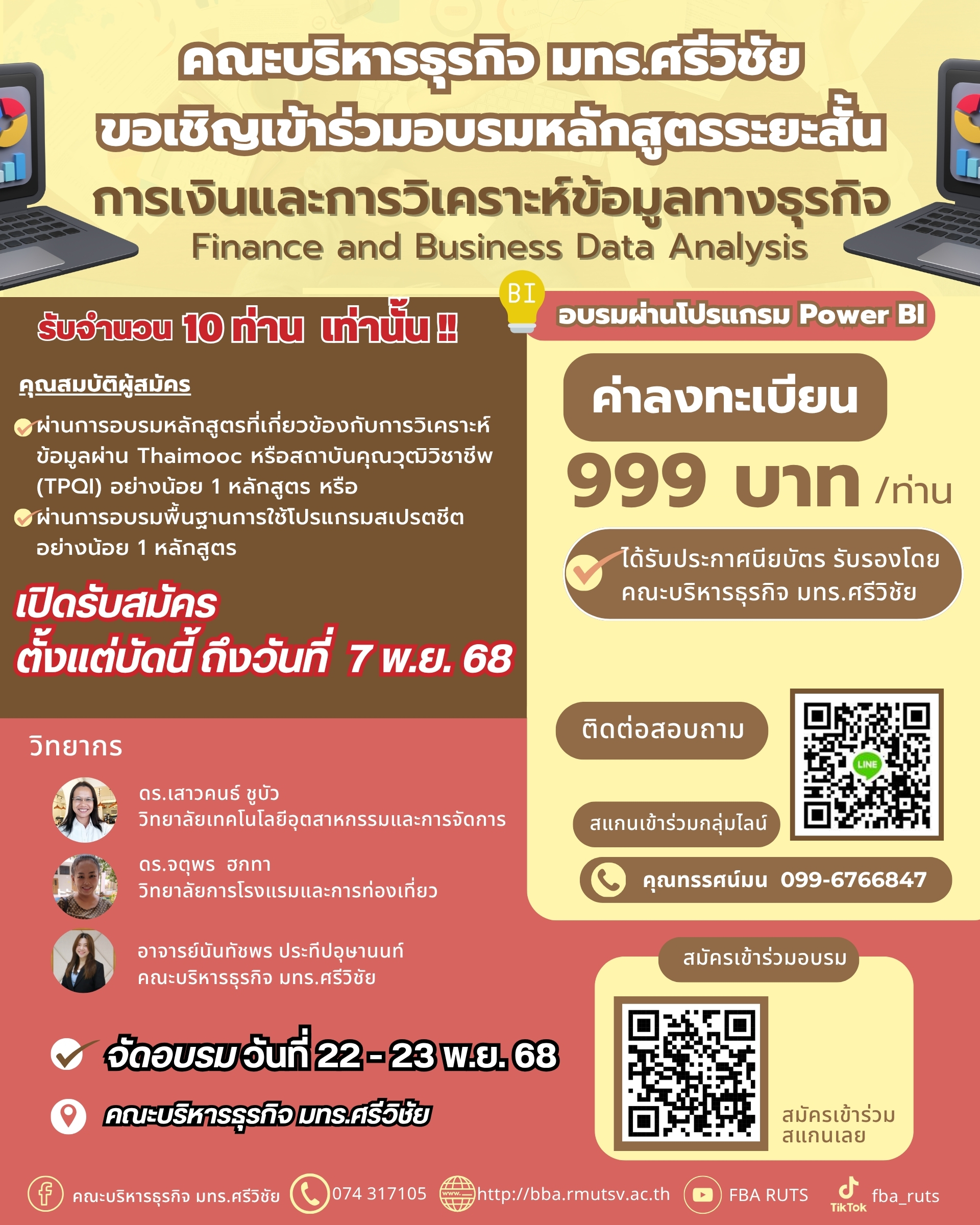 📊 เปิดรับสมัครแล้ว! โครงการอบรม “การเงินและการวิเคราะห์ข้อมูลทางธุรกิจ : Finance and Business Data Analysis”