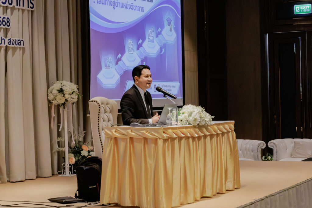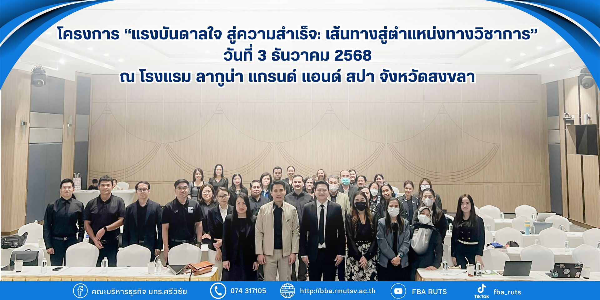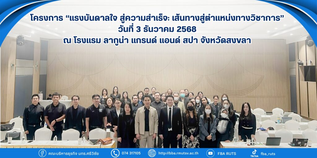 คณะบริหารธุรกิจ มหาวิทยาลัยเทคโนโลยีราชมงคลศรีวิชัย จัดโครงการ “แรงบันดาลใจ สู่ความสำเร็จ: เส้นทางสู่ตำแหน่งทางวิชาการ” วันที่ 3 ธันวาคม 2568 ณ โรงแรม ลากูน่า แกรนด์ แอนด์ สปา จังหวัดสงขลา โดยได้รับเกียรติจาก ศาสตราจารย์ ดร.กล้าหาญ ณ น่าน คณบดีคณะบริหารธุรกิจ มหาวิทยาลัยเทคโนโลยีราชมงคลธัญบุรี เป็นวิทยากรบรรยายในหัวข้อความหมายของความสำเร็จและแรงจูงใจอาจารย์ยุคใหม่ เส้นทางสู่ตำแหน่งทางวิชาการในประเทศไทย เกณฑ์มาตรฐานใหม่ กพอ./อว. กลยุทธ์การทำงานวิชาการ 5 ด้าน และเคล็ดลับการวิจัยและตีพิมพ์นานาชาติ โดยมี ผู้ช่วยศาสตราจารย์ชัยนันท์ ปัญญาวุทโส คณบดีคณะบริหารธุรกิจ กล่าวต้อนรับและเปิดโครงการ ซึ่งกิจกรรมครั้งนี้มุ่งสร้างแรงบันดาลใจและแนวทางการพัฒนาศักยภาพทางวิชาการแก่อาจารย์เพื่อก้าวสู่ความสำเร็จในอนาคต